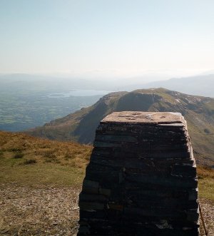 Looking back to Moelwyn Bach from the summit of Moelwyn Mawr, with Llyn Trawsfynydd in the backgroun